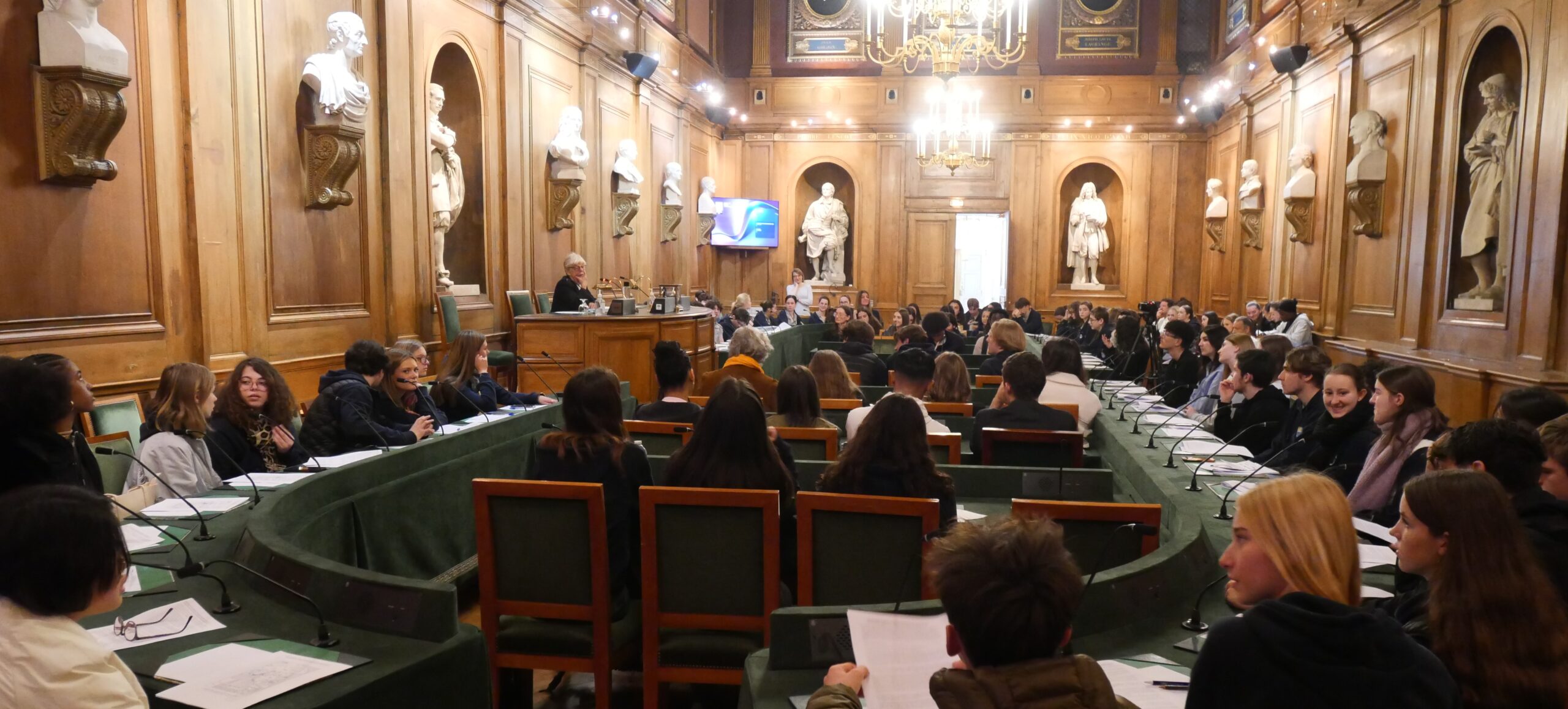 Le vendredi 11 avril 2025, l’Académie a accueilli 140 élèves de Seconde et Première des lycées Pierre de Coubertin (Meaux), conduits par M. Guilhem Tixier, professeur de Philosophie et Mme Noémie Nury, professeur de Lettres classiques, Samuel de Champlain (Chennevières-sur-Marne), conduits par M. Pierre Antoine Adad, professeur de Lettres classiques, et Saint François de Sales Thérèse Chappuis (Paris), conduits par Mme Auriane Perrier, professeur de Philosophie.
