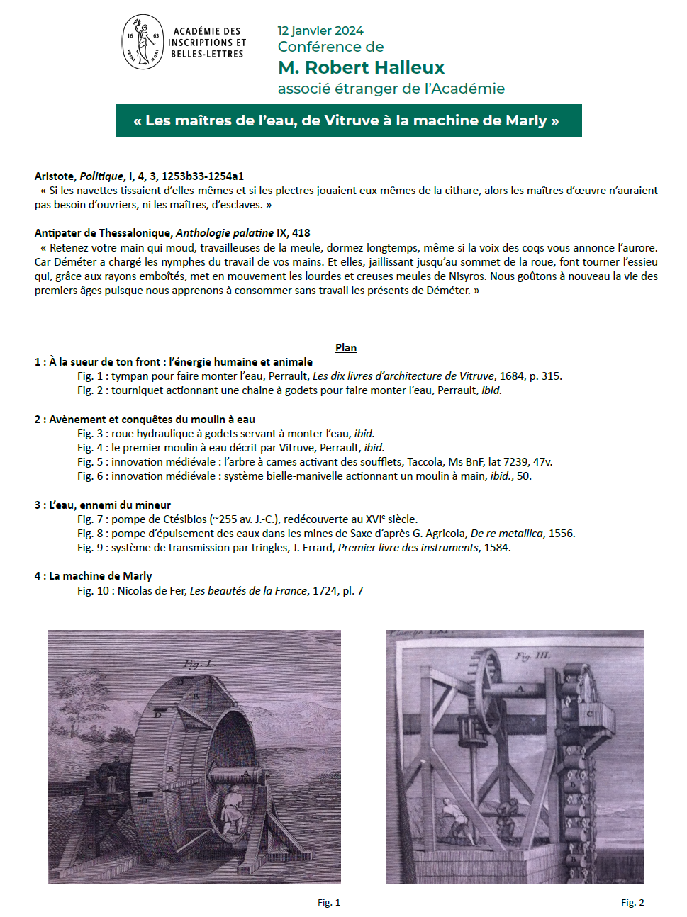 L’ensemble des élèves se sont ensuite réunis dans la grande Salle des séances de l’Académie, où M. Robert HALLEUX leur a présenté une conférence intitulée « Les maîtres de l’eau, de Vitruve à la machine de Marly », suivie d’échanges nourris.