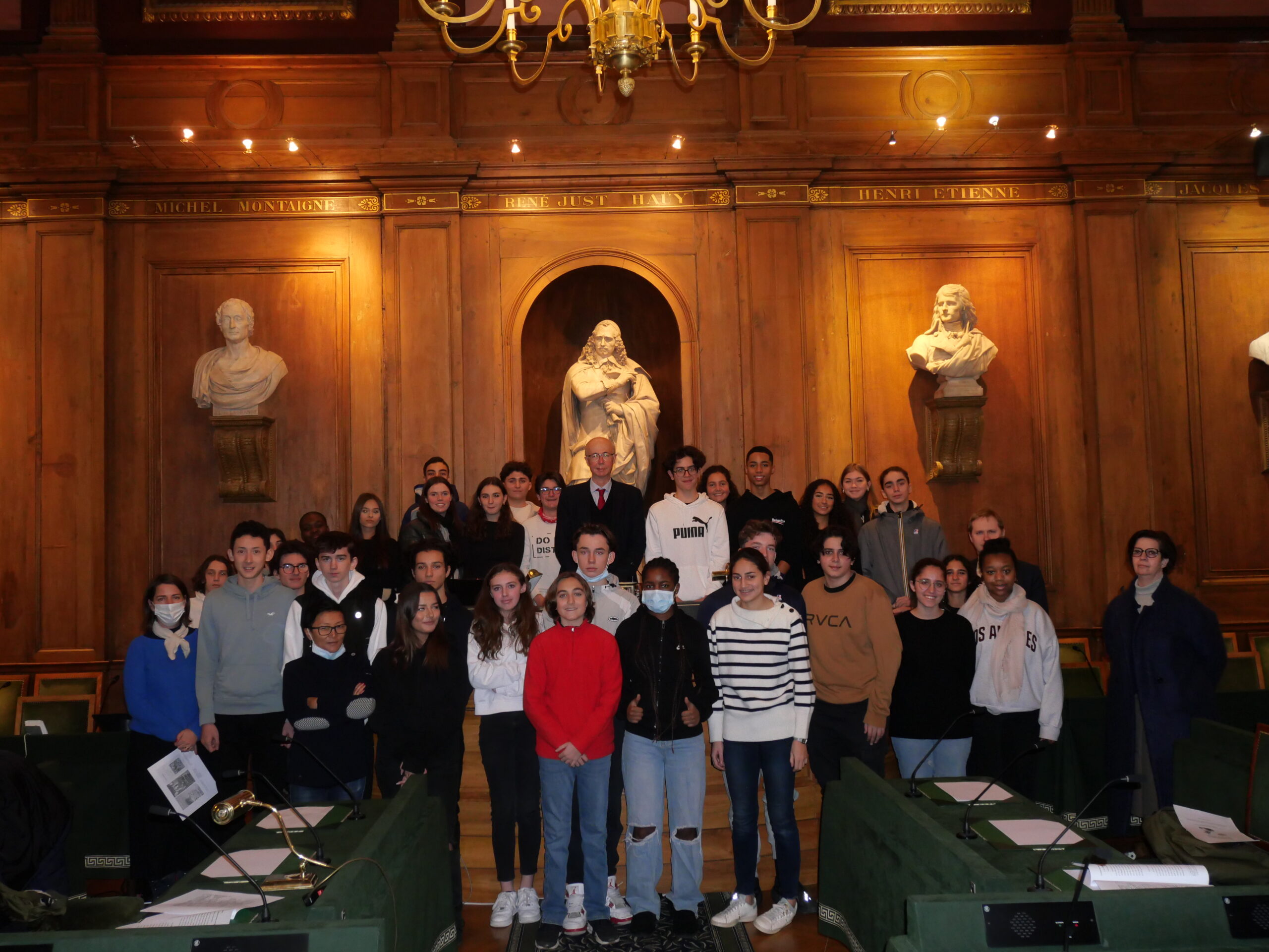 Le 16 décembre 2022, l’Académie a accueilli un groupe de 36 élèves de seconde du Lycée La Folie Saint-James (Neuilly-sur-Seine), conduits par leur professeur d’histoire-géographie, Mme Lemaignen-Wajsztok.