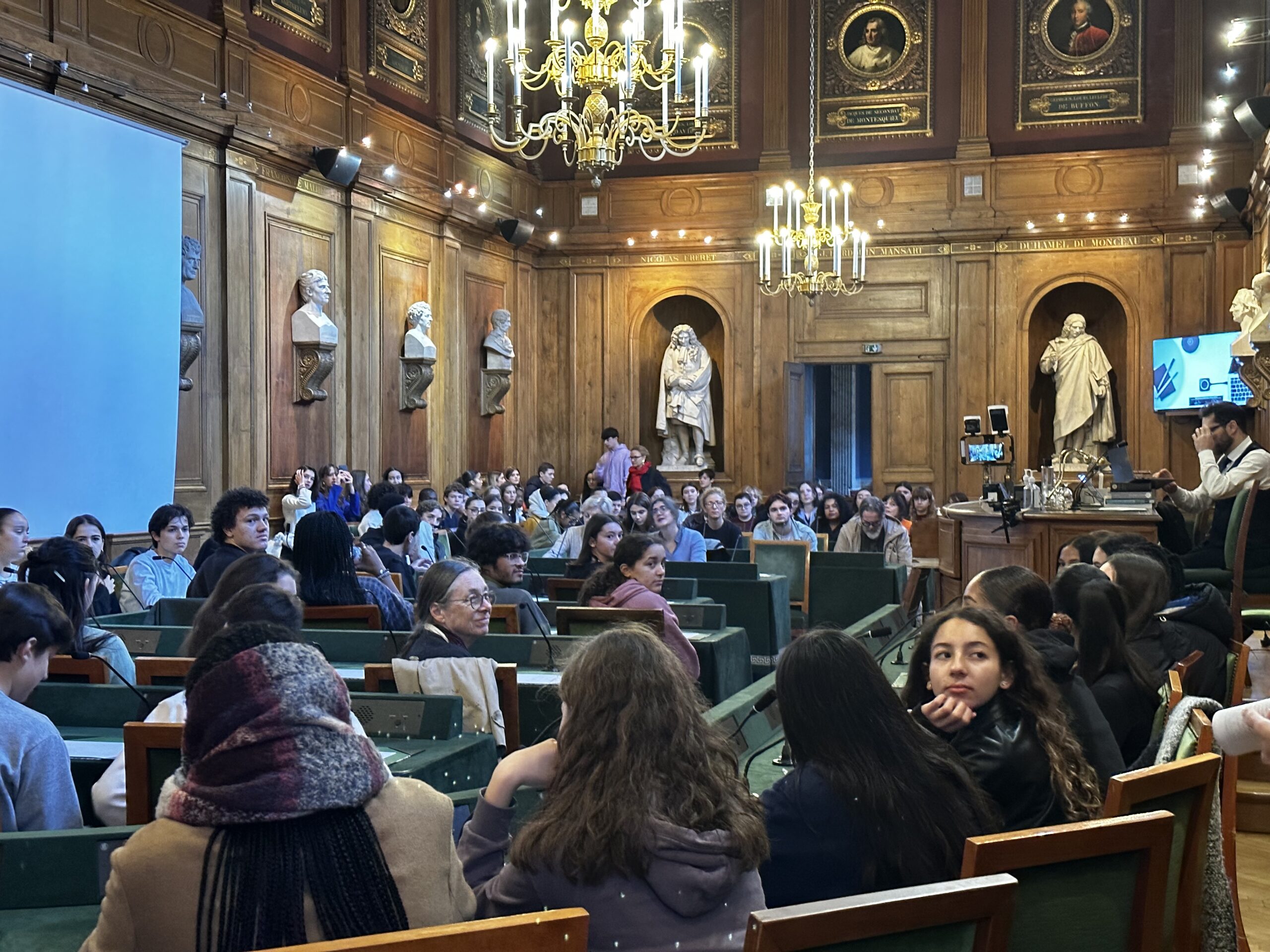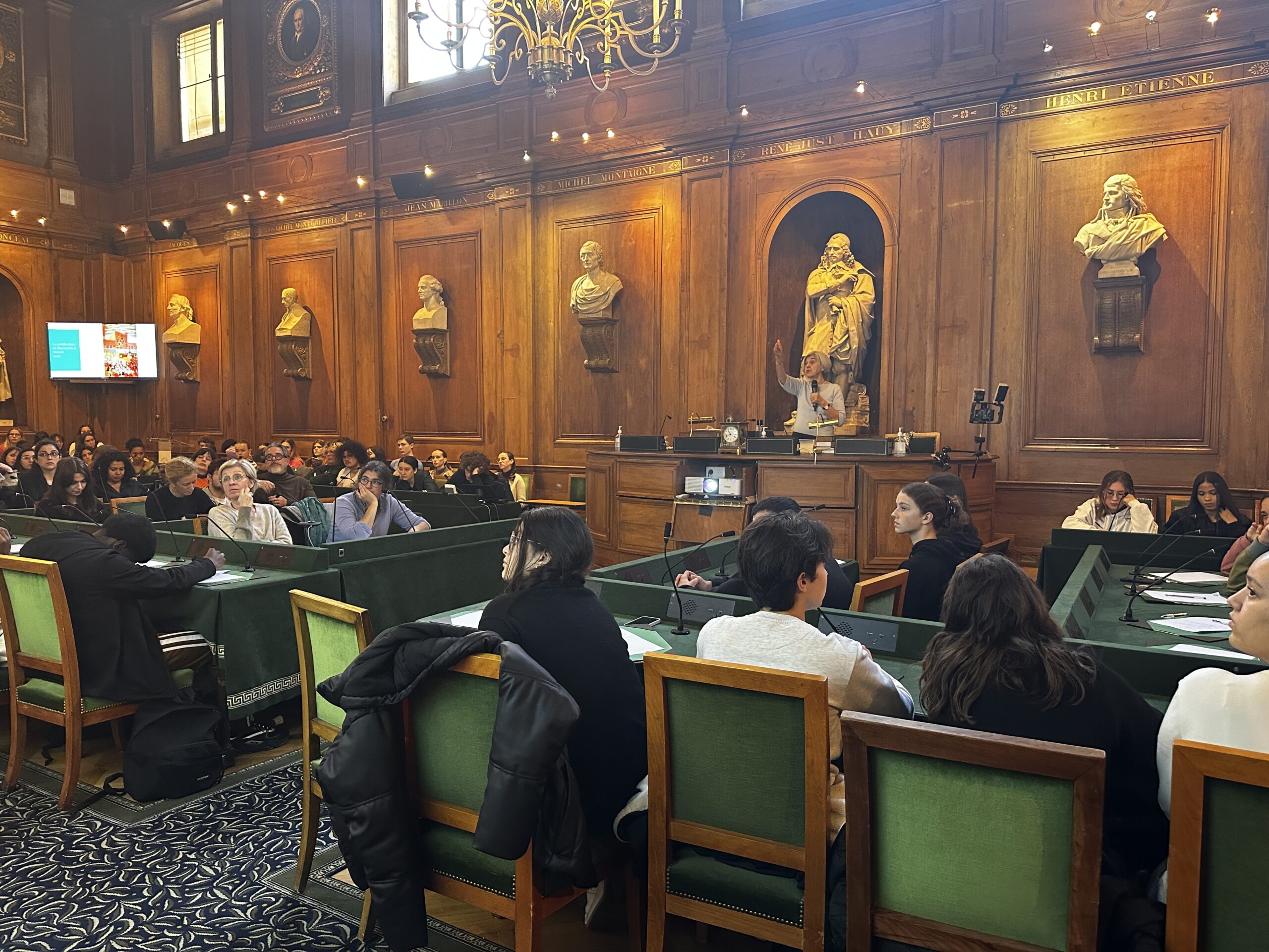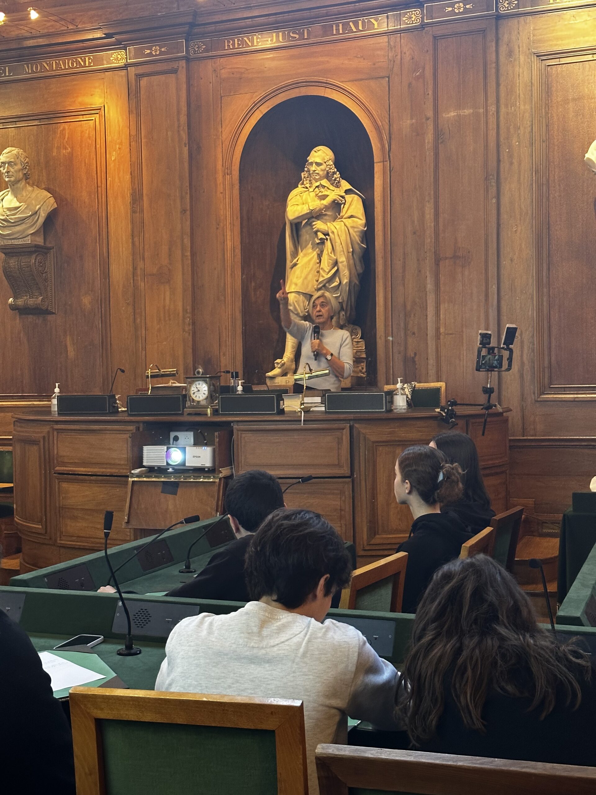 L’ensemble des élèves a d’abord rejoint la grande Salle des Séances de l’Académie dans laquelle Mme Nicole BÉRIOU a donné un exposé intitulée « Un art de la prédication au Moyen Âge : les prédicateurs, experts de la parole publique dans les villes ? ».