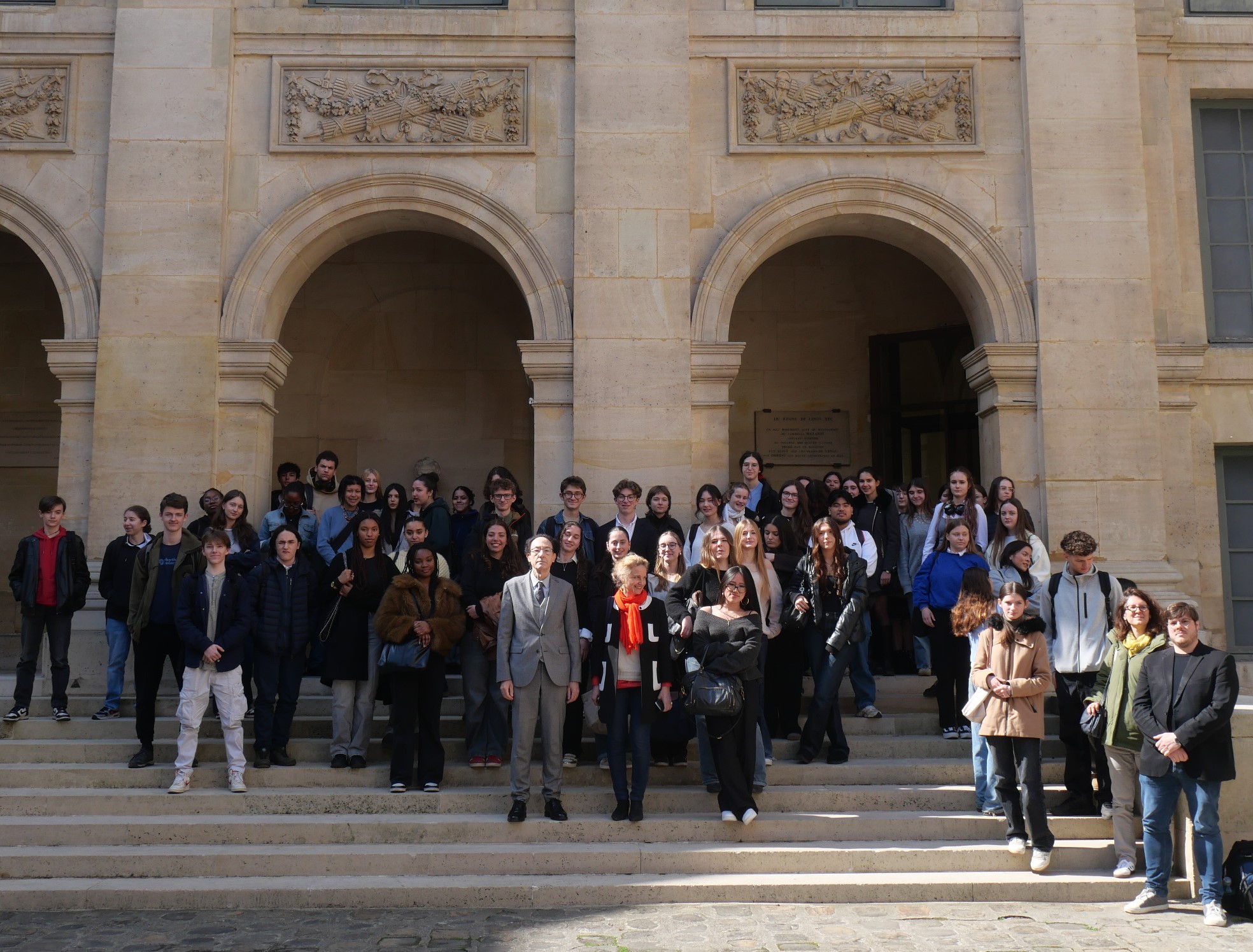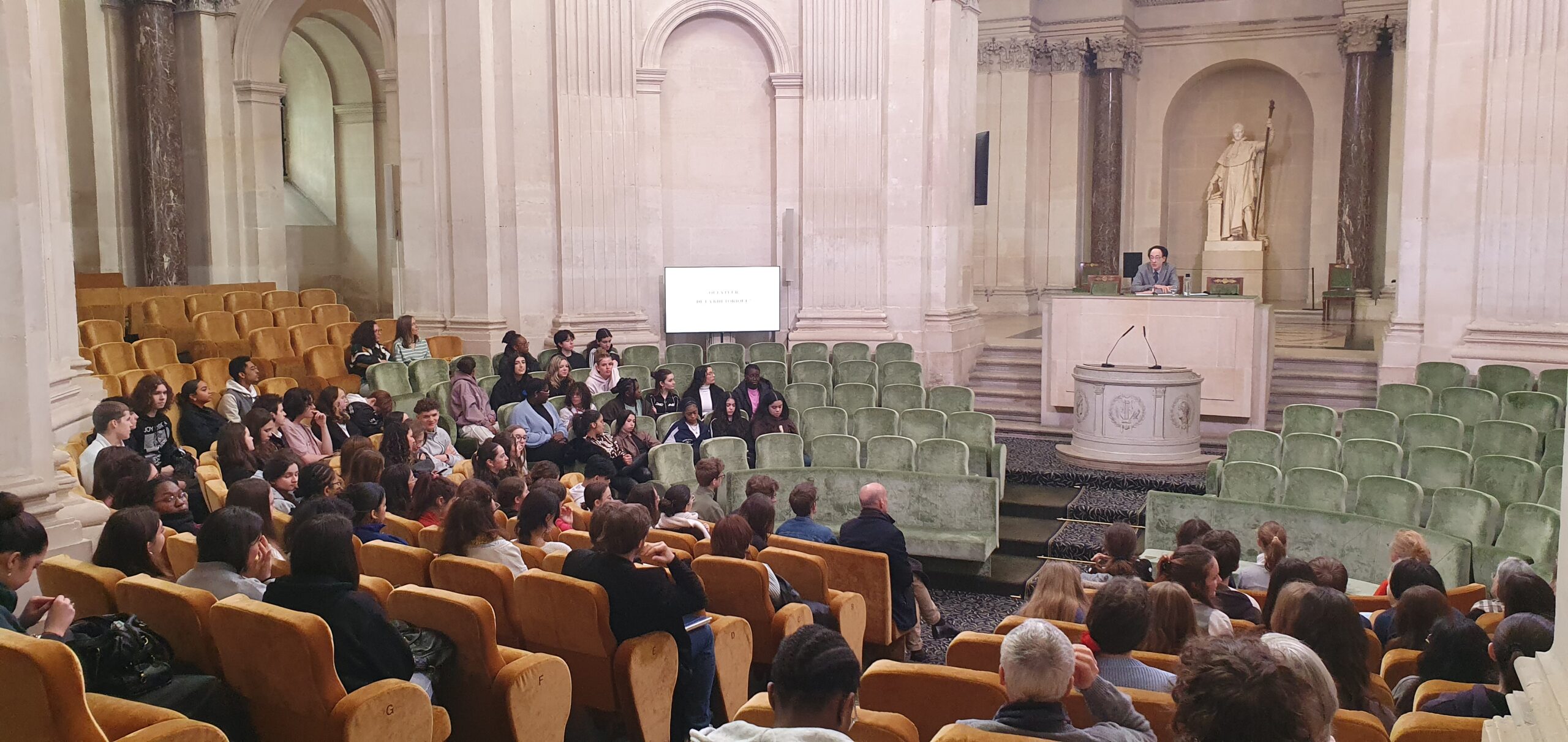 Le vendredi 28 mars 2025, dans le cadre de son programme d’actions pédagogiques « Rencontres avec un Académicien », l’Académie des Inscriptions et Belles-Lettres a accueilli un groupe de 150 élèves de Première suivant la spécialité Humanités, Littérature et Philosophie des lycées Marie Curie (Sceaux), conduits par Mmes Patricia Doukhan, professeur de Philosophie, et Martine Poupineau, professeur de Lettres classiques, Rabelais (Meudon), conduits par Mme Elsa Jollès, professeur de Lettres classiques, la Mare Carrée (Moissy-Cramayel), conduits par Mme Salomé Wach, professeur de Lettres et Hoche (Versailles), conduits par Mme Marie-Hélène Jacquemin de la Touvière, professeur de Lettres classiques.
