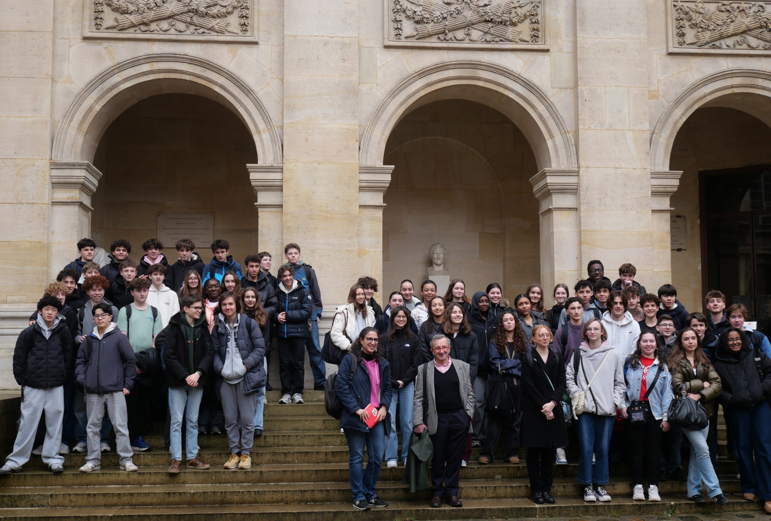 Mme  Christine Tardiveau et M. Matthieu Guyot, professeurs détachés à l’Académie, leur ont d’abord fait visiter le palais de l’Institut et leur ont exposé l’histoire du Palais, primitivement Collège des Quatre-Nations, ainsi que l’origine et les missions scientifiques de l’Académie des Inscriptions et Belles-Lettres.