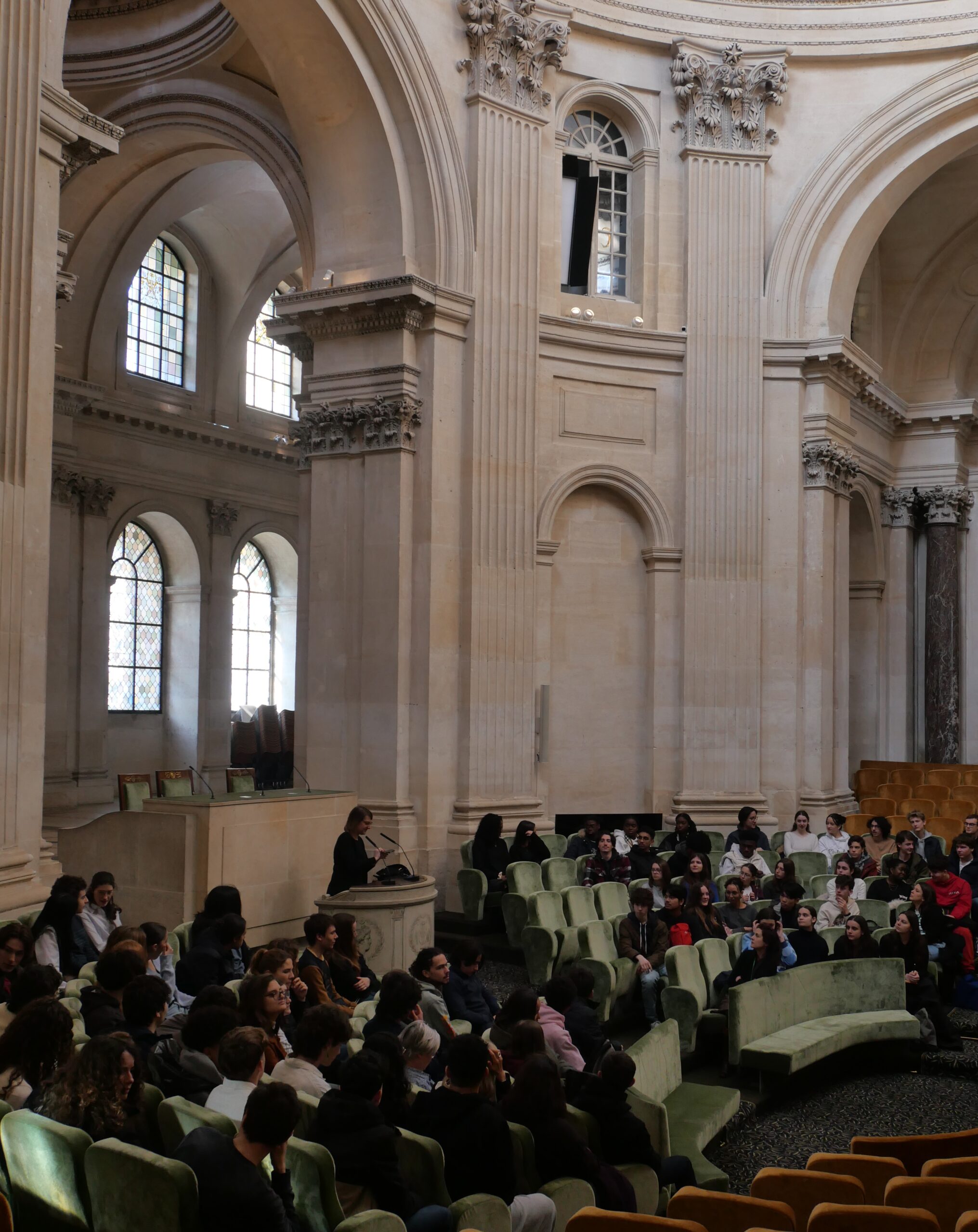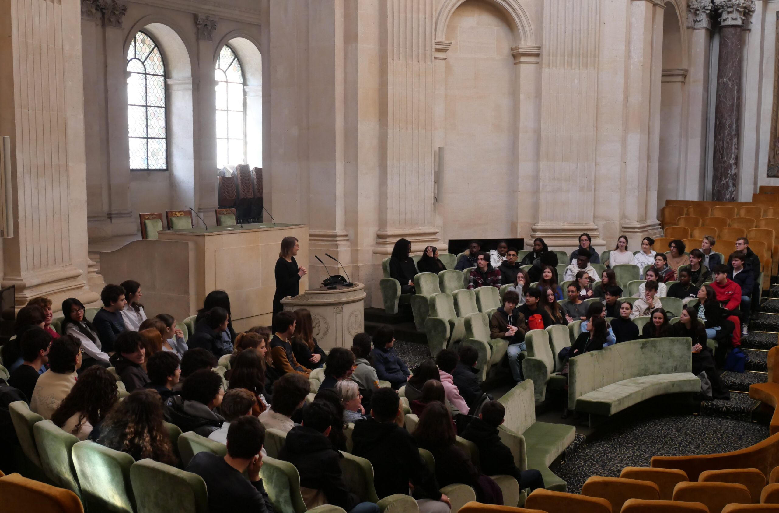 Le vendredi 8 mars 2024, dans le cadre de son programme d’actions pédagogiques « Rencontres avec un Académicien », l’Académie a accueilli un groupe de 80 lycéens d’Île-de-France. Les élèves étaient pour une part des Secondes, Premières et Terminales, latinistes et hellénistes, du lycée Marie Curie (Sceaux), conduits par Mmes Pascale Lebrun et Martine Poupineau, professeurs de Lettres classiques, et pour l’autre des Premières et Terminales, latinistes, du lycée Émilie du Châtelet (Serris), conduits par Mme Violaine Veyrat, professeur de Lettres classiques.