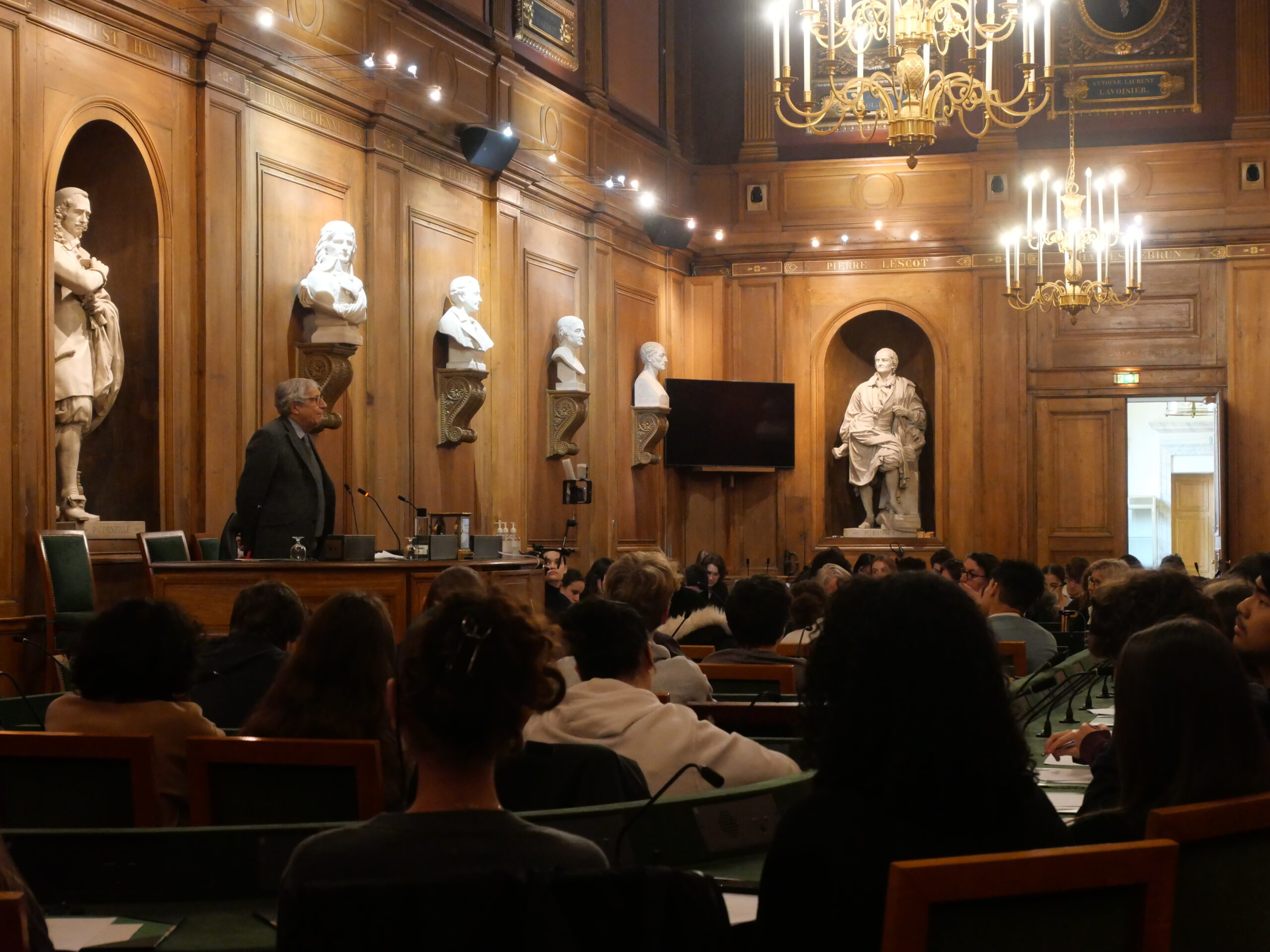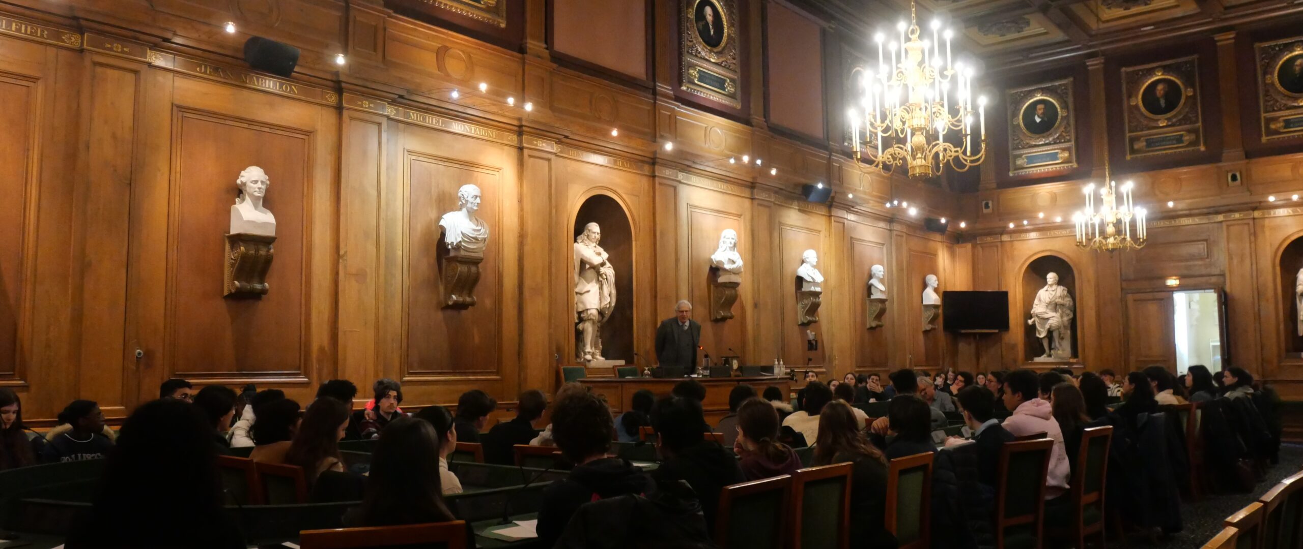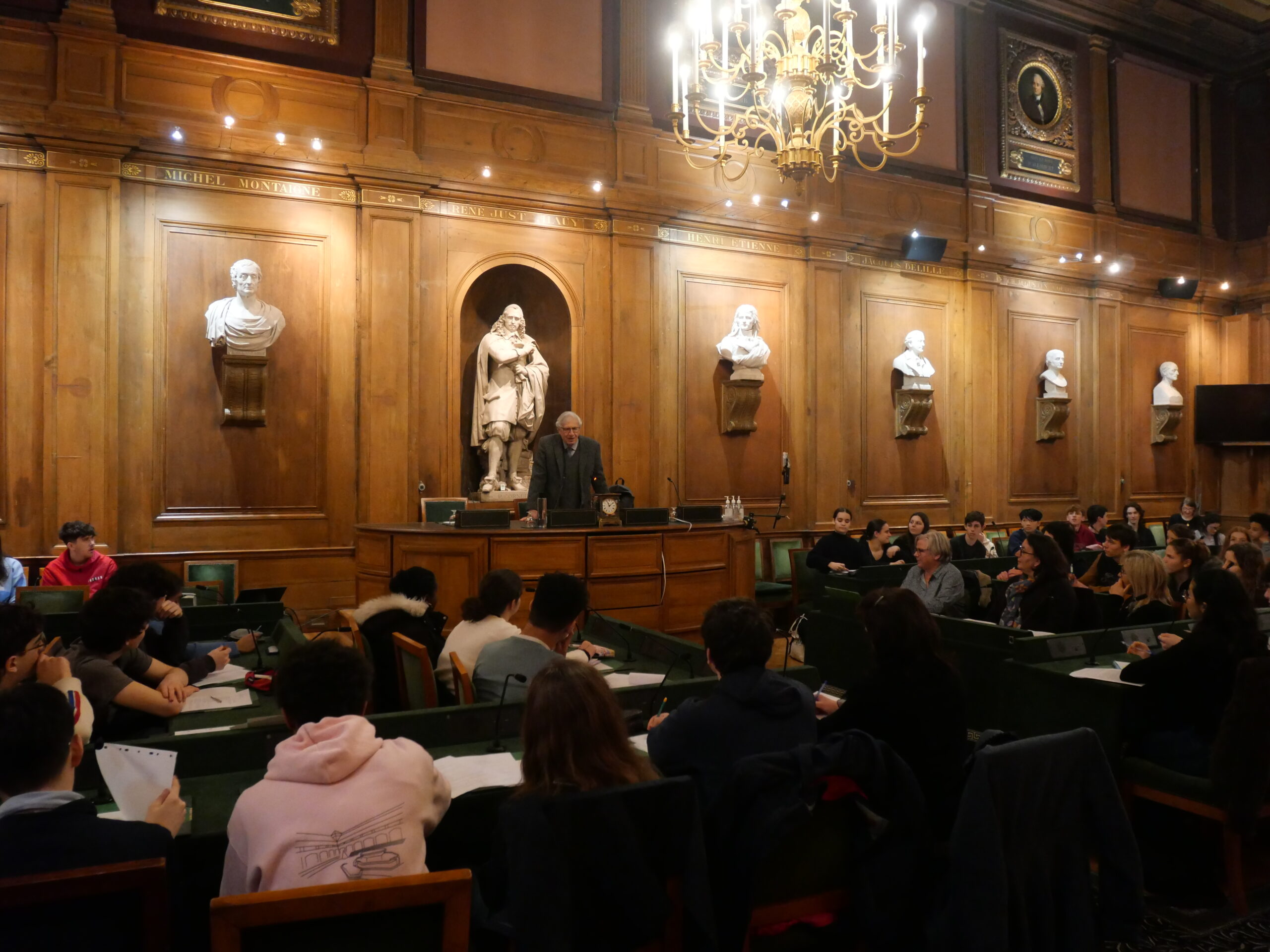 L’ensemble des élèves se sont enfin réunis dans la grande salle des Séances, où M. Carlos LÉVY, membre de l’Académie, leur a présenté une conférence intitulée « Aimer à Rome », suivie d’échanges nourris.