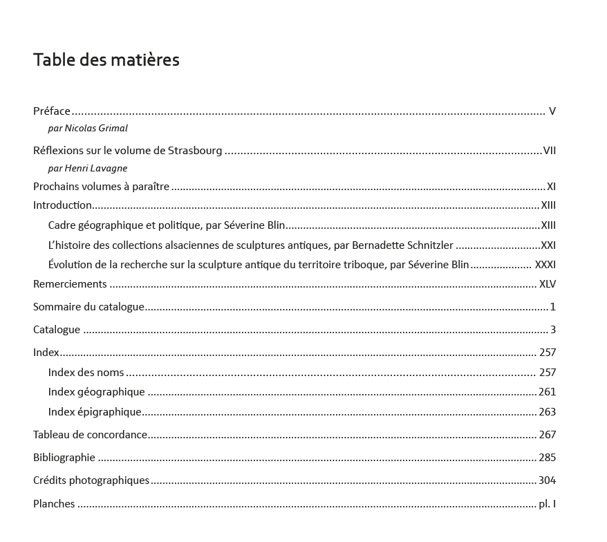 Avec ce volume composé de 672 notices, sont proposés un inventaire complet et une étude actualisée des reliefs et des sculptures antiques de Gaule romaine et des Germanies conservés dans les musées et les collections particulières de Brumath, Strasbourg et la cité des Triboques. Comme dans le cas des précédents volumes, on observe un accroissement remarquable des collections, depuis l’édition, en 1918-1925, par Émile ESPÉRANDIEU (1857-AIBL 1919-1939) des tomes consacrés à la Gaule germanique, puisqu’elles ont notamment été doublées pour le seul territoire triboque. S’y ajoutent les nombreuses pièces inédites issues de quelques sites rauraques situés dans le Sud de l’Alsace, ainsi que les découvertes du sanctuaire du Donon auxquelles une utile synthèse est fournie. Rassembler et ordonner les sculptures et reliefs triboques permet de révéler les singularités d’un corpus fécond, où la tradition italique se distingue dès le début du Iᵉʳ siècle apr. J.-C. sur les reliefs des monuments funéraires, comme dans la diffusion et la maîtrise d’un répertoire classique se manifestant sur plusieurs séries de représentations divines – ce qui permet de porter un regard neuf sur les processus de création et d’adaptation des représentations figurées dans différents sites, et avec des matériaux locaux, au cours des IIe et IIIe siècles. L’ensemble de ces observations autorise désormais à renouveler les interprétations sur cette production d’images illustrant pleinement l’expression d’une romanité provinciale.