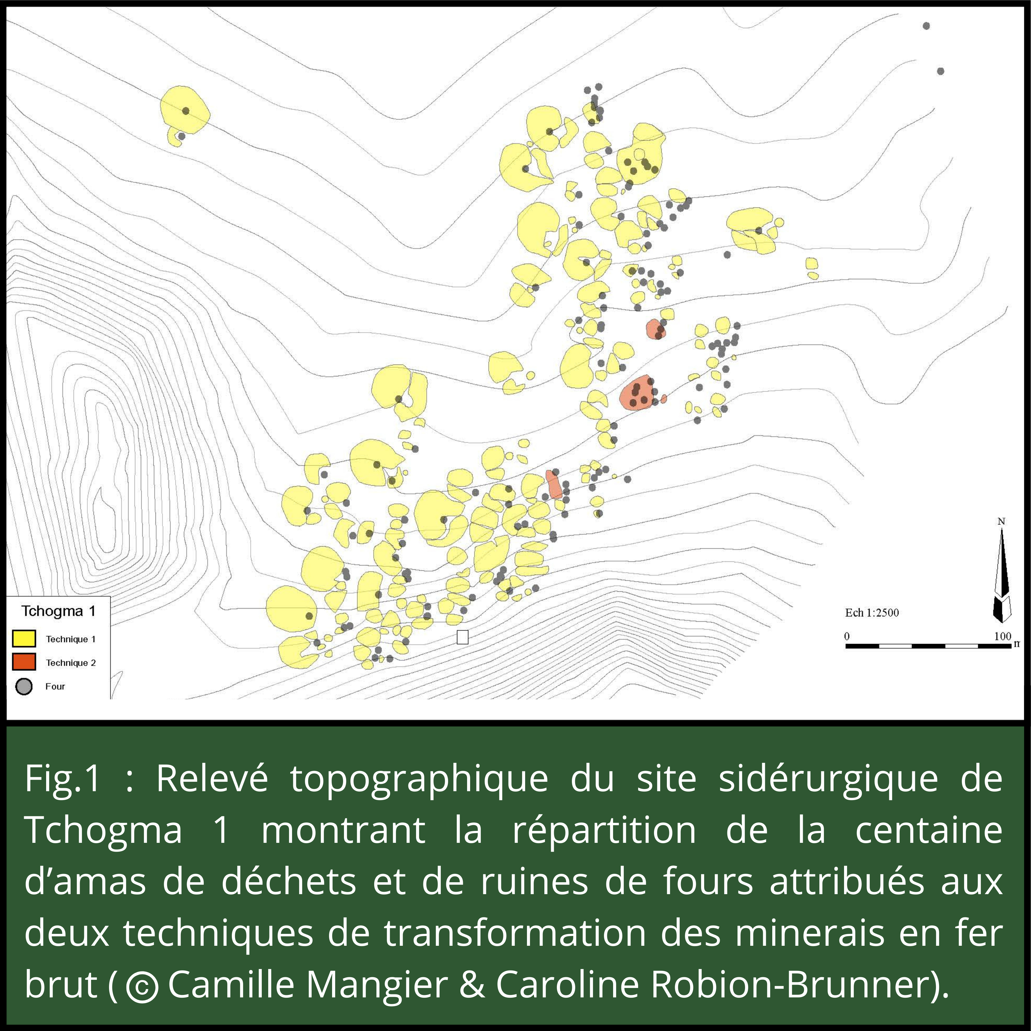 - Figure 1 : Relevé topographique du site sidérurgique de Tchogma 1 montrant la répartition de la centaine d’amas de déchets et de ruines de fours attribués aux deux techniques de transformation des minerais en fer brut (©Camille Mangier & Caroline Robion-Brunner) ;