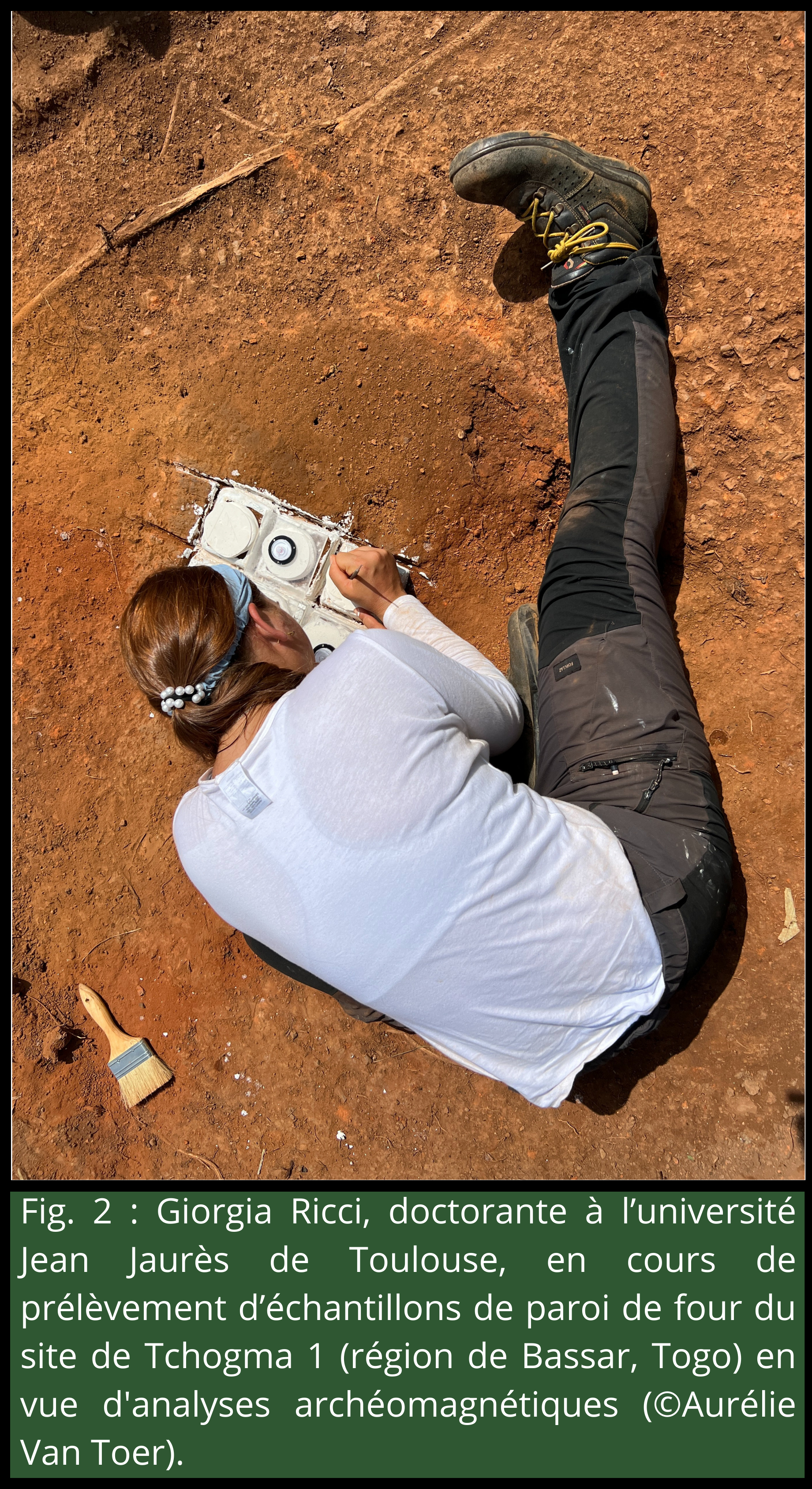 - Figure 2 : Giorgia Ricci, doctorante à l’université Jean Jaurès de Toulouse, en cours de prélèvement d’échantillons de paroi de four du site de Tchogma 1 (région de Bassar, Togo) en vue d’analyses archéomagnétiques (©Aurélie Van Toer) ;