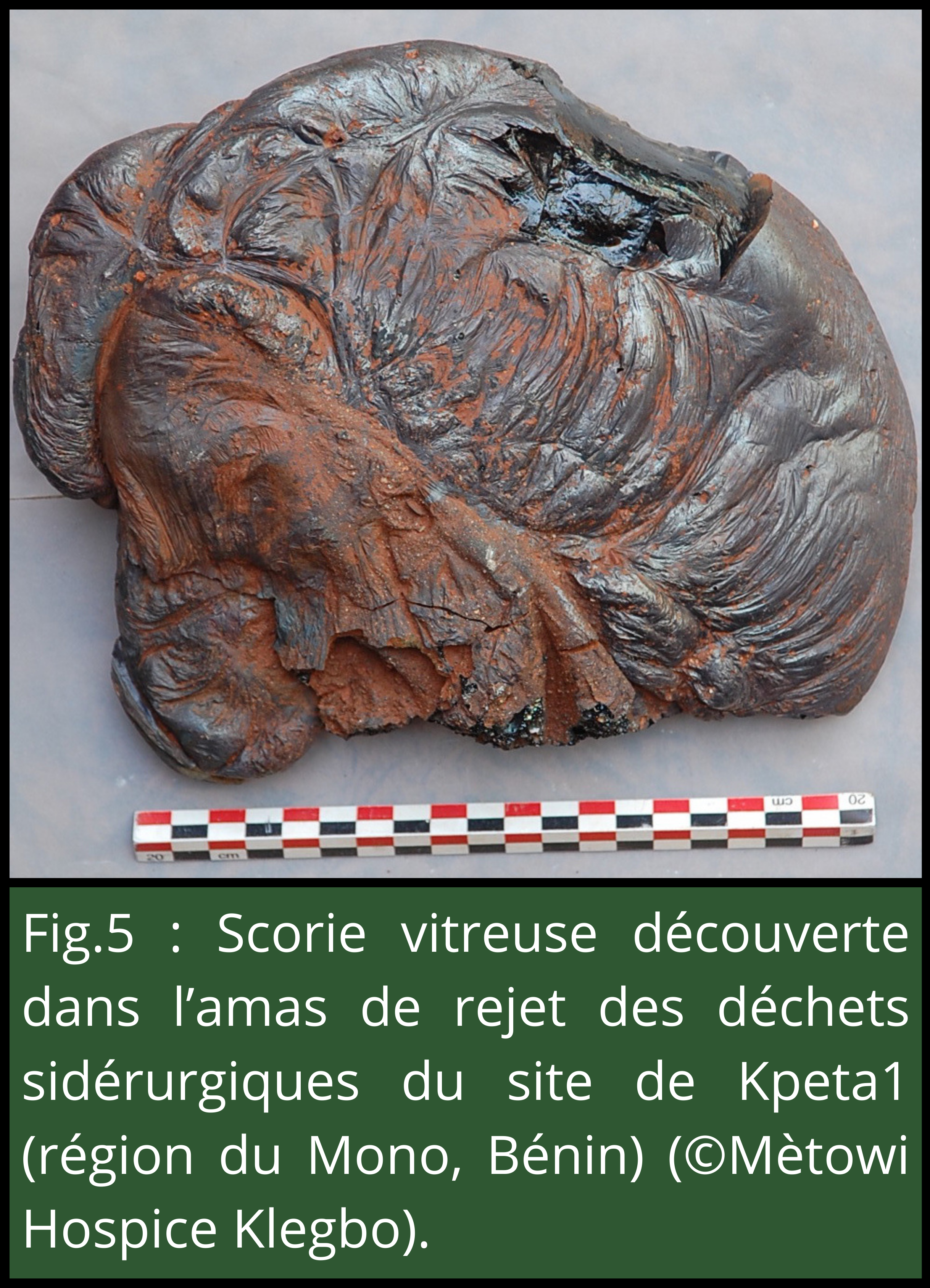 - Figure 5 : Scorie vitreuse découverte dans l’amas de rejet des déchets sidérurgiques du site de Kpeta1 (région du Mono, Bénin) (©Mètowi Hospice Klegbo) ;