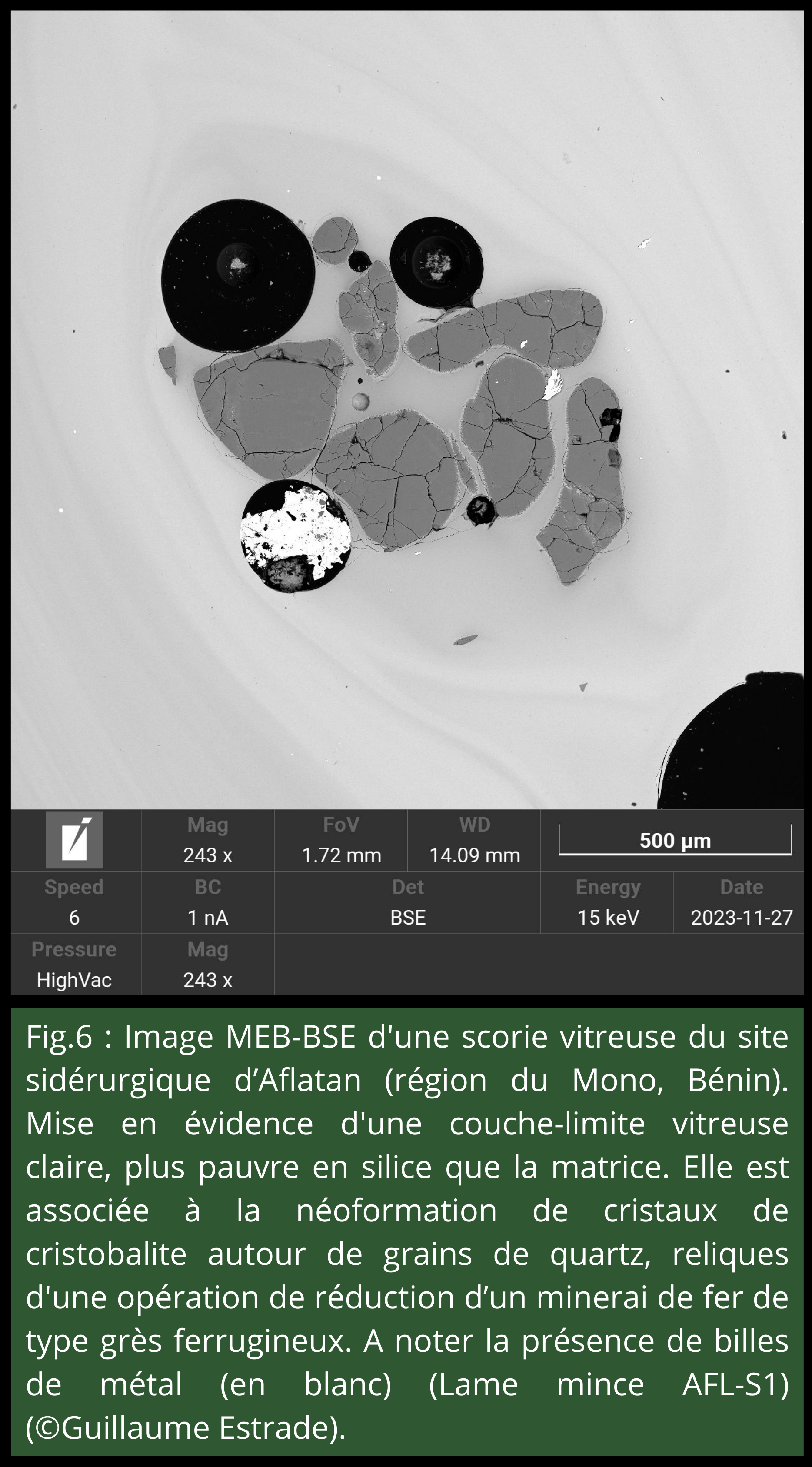 - Figure 6 : Image MEB-BSE d’une scorie vitreuse du site sidérurgique d’Aflatan (région du Mono, Bénin). Mise en évidence d’une couche limite vitreuse claire, plus pauvre en silice que la matrice. Elle est associée à la néoformation de cristaux de cristobalite autour de grains de quartz, reliques d’une opération de réduction d’un minerai de fer de type grès ferrugineux. À noter la présence de billes de métal (en blanc) (Lame mince AFL-S1) (©Guillaume Estrade).