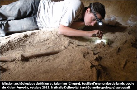 - Fig. 2. Fouille d’une tombe de la nécropole de Kition-Pervolia, octobre 2012. Nathalie Delhopital (archéo-anthropologue) au travail.