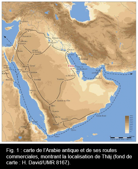 - Fig. 1 : carte de l’Arabie antique et de ses routes commerciales, montrant la localisation de Thāj (fond de carte : H. David/UMR 8167).