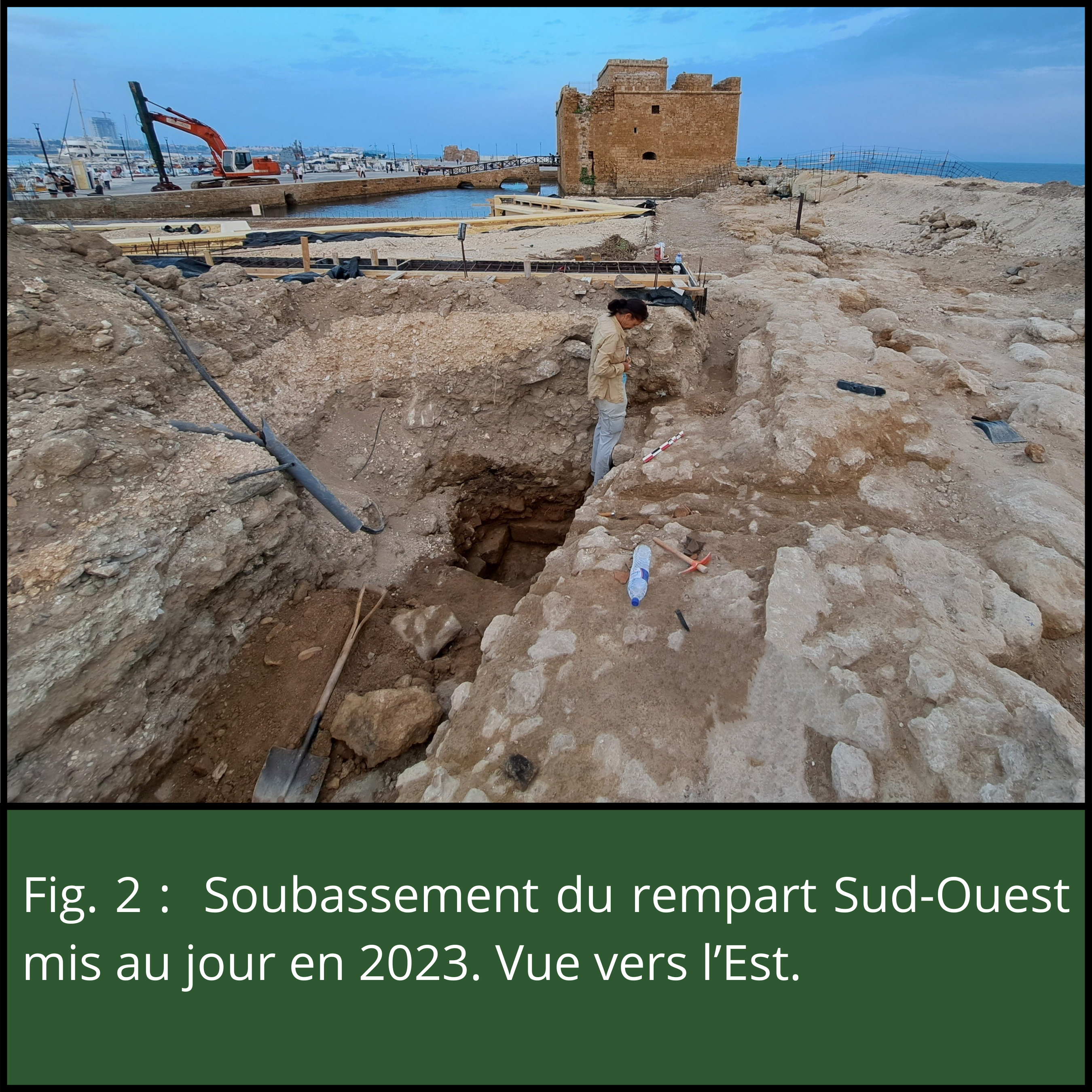 - Figure 2 : Soubassement du rempart Sud-Ouest mis au jour en 2023. Vue vers l’Est ;
