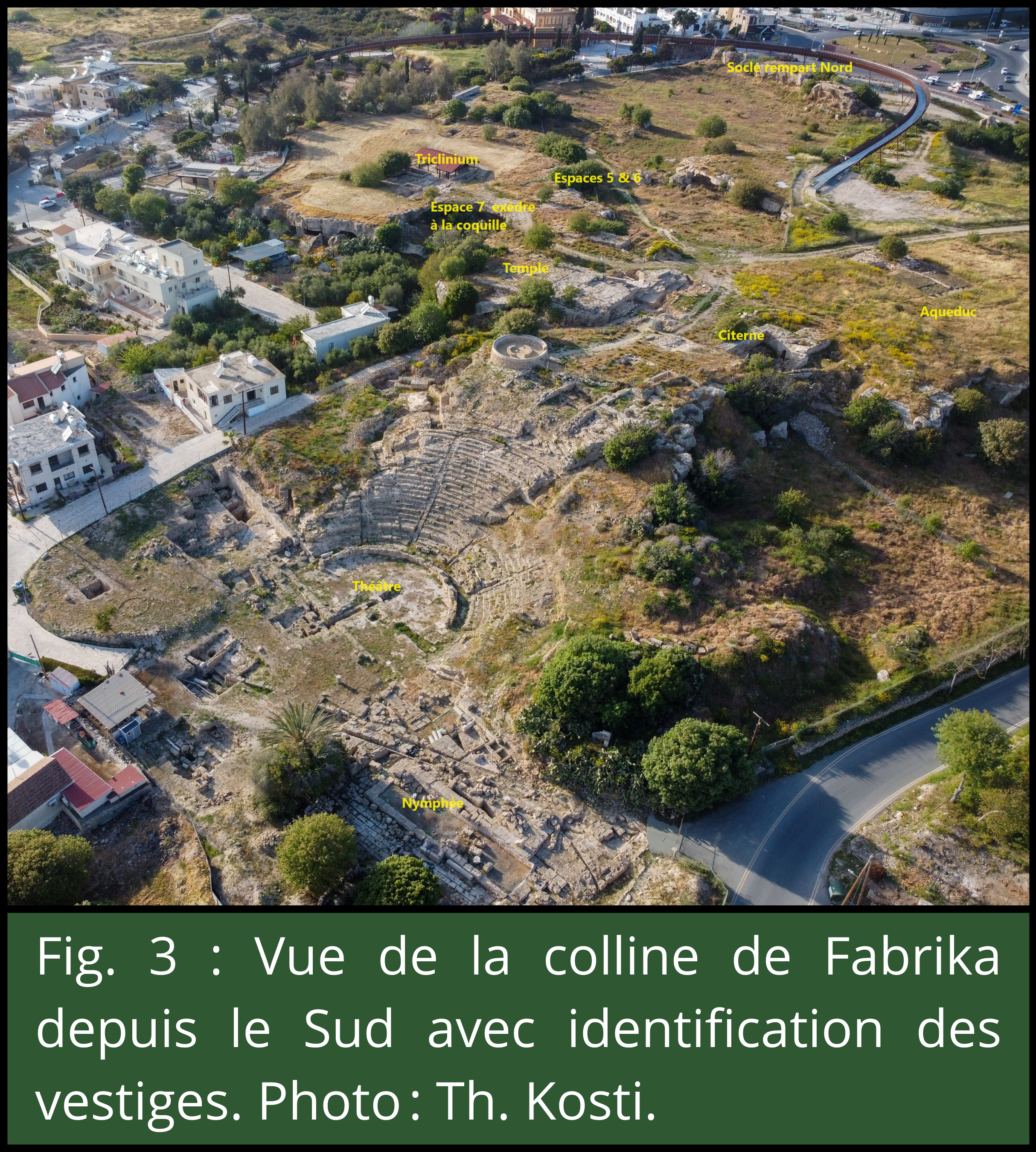 - Figure 3 : Vue de la colline de Fabrika depuis le Sud avec identification des vestiges. Photo : Th. Kosti ;