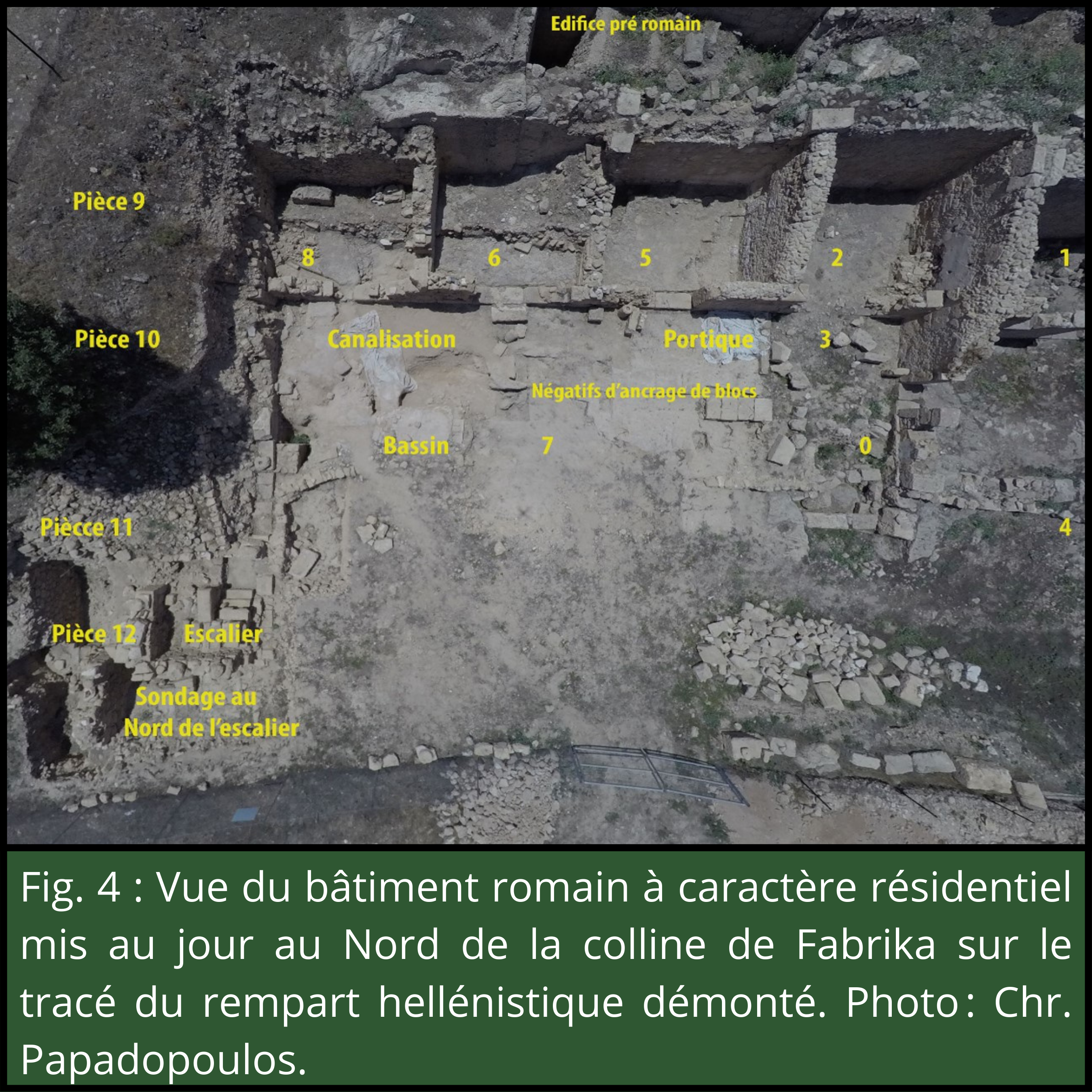 - Figure 4 : Vue du bâtiment romain à caractère résidentiel mis au jour au Nord de la colline de Fabrika sur le tracé du rempart hellénistique démonté. Photo : Chr. Papadopoulos ;