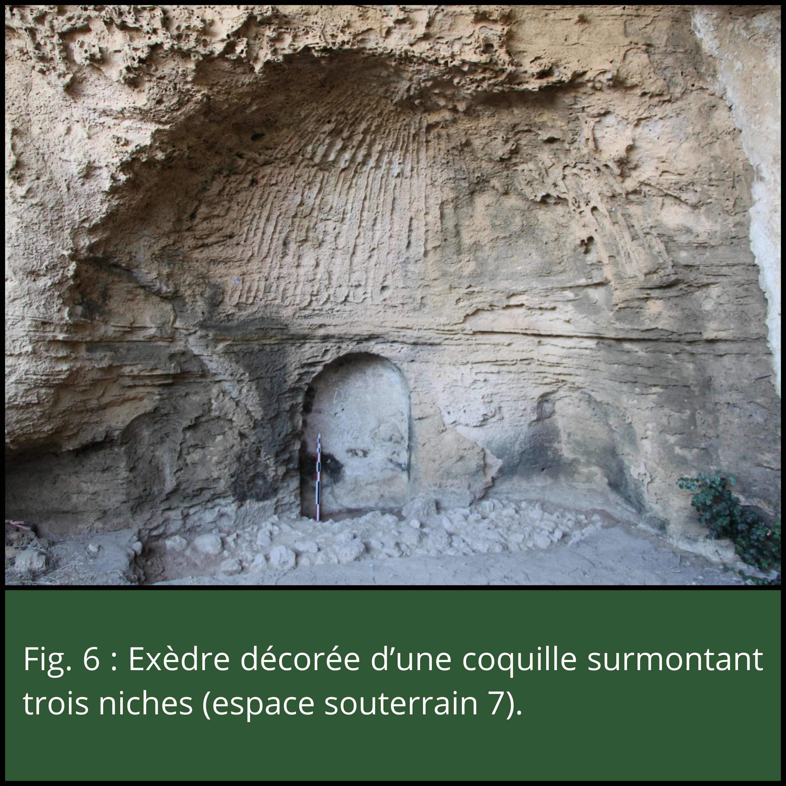 - Figure 6 : Exèdre décorée d’une coquille surmontant trois niches (espace souterrain 7) ;