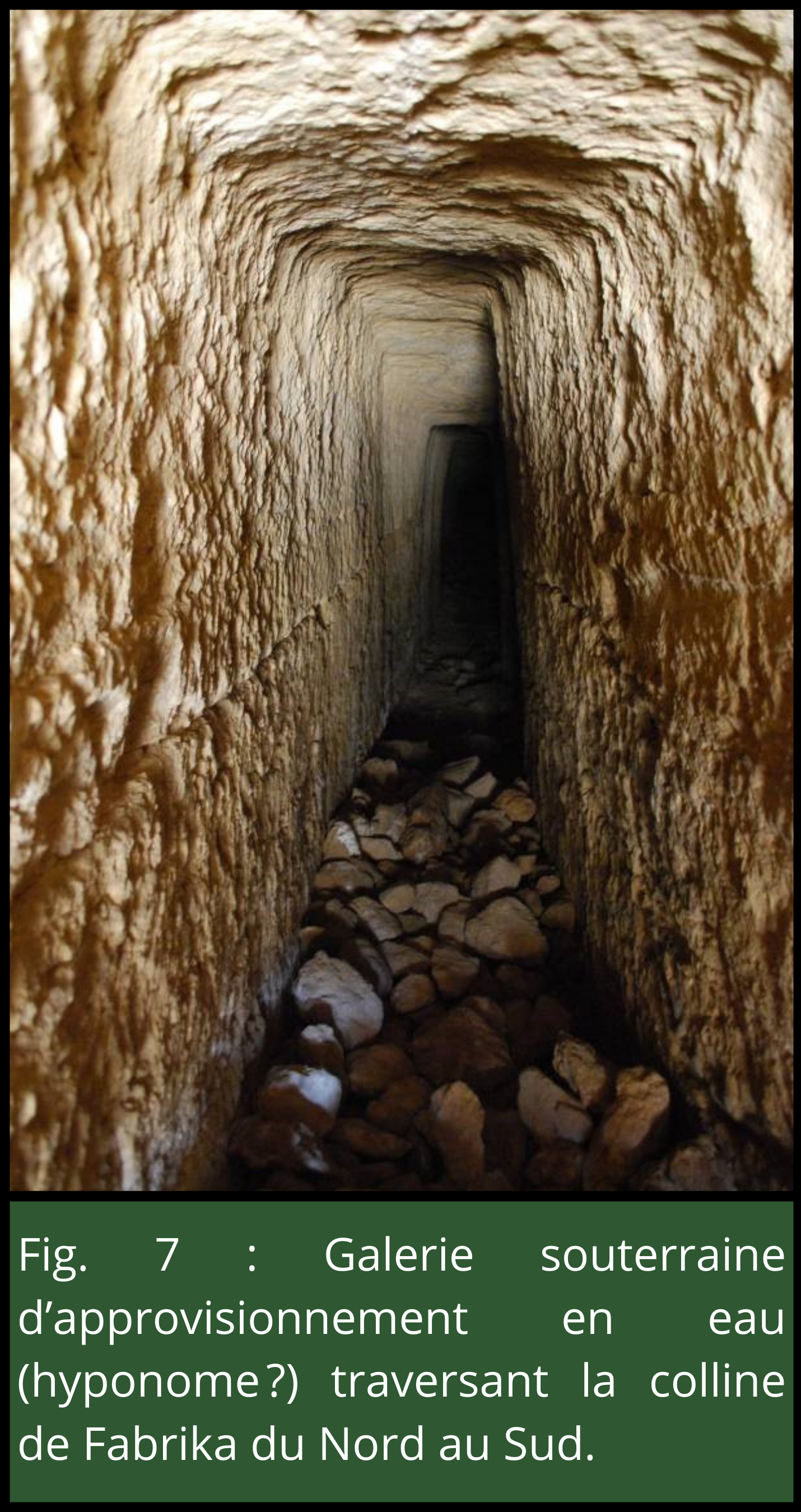 - Figure 7 : Galerie souterraine d’approvisionnement en eau (hyponome ?) traversant la colline de Fabrika du Nord au Sud.