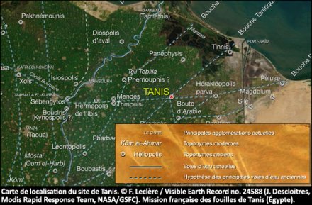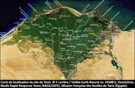- 1. Carte de localisation du site de Tanis. © F. Leclère / Visible Earth Record no. 24588 (J. Descloitres, Modis Rapid Response Team, NASA/GSFC).