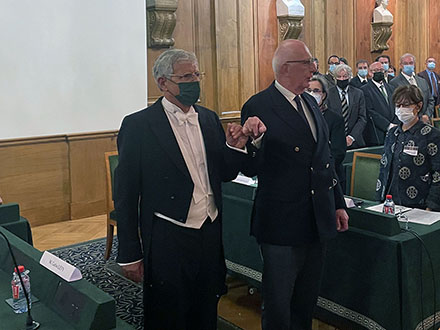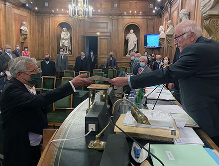 Le vendredi 1er octobre 2021, s’est déroulée la cérémonie de réception de l’antiquisant, historien de la philosophie hellénistique et romaine, Carlos LÉVY, élu membre de l’AIBL le 21 mai 2021, au fauteuil de Jean-Louis FERRARY. Après avoir été introduit et présenté à ses confrères par le Secrétaire perpétuel Michel ZINK, M. LÉVY a reçu des mains du Président Yves-Marie BERCÉ le décret le nommant membre de l’Académie ainsi que la médaille de membre de l’Institut.
