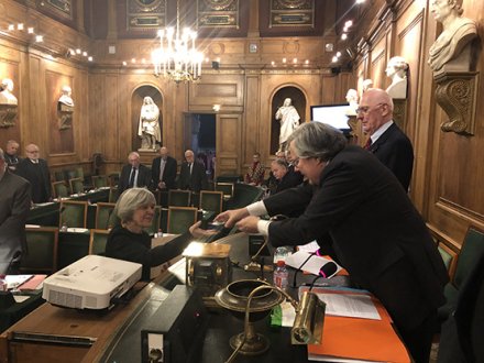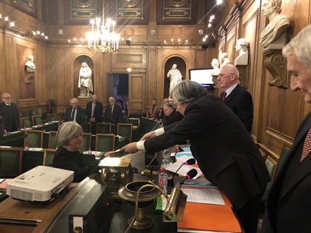 Le vendredi 1er février 2019, s’est déroulée la cérémonie de réception de la médiéviste Nicole BÉRIOU, élue membre de l’Académie le 9 novembre 2018, au fauteuil d’Alain MICHEL. Après avoir été introduite et présentée à ses confrères par le Secrétaire perpétuel Michel ZINK, elle a reçu des mains du Président Jean-Noël ROBERT le décret la nommant membre de l’Académie ainsi que la médaille de membre de l’Institut.