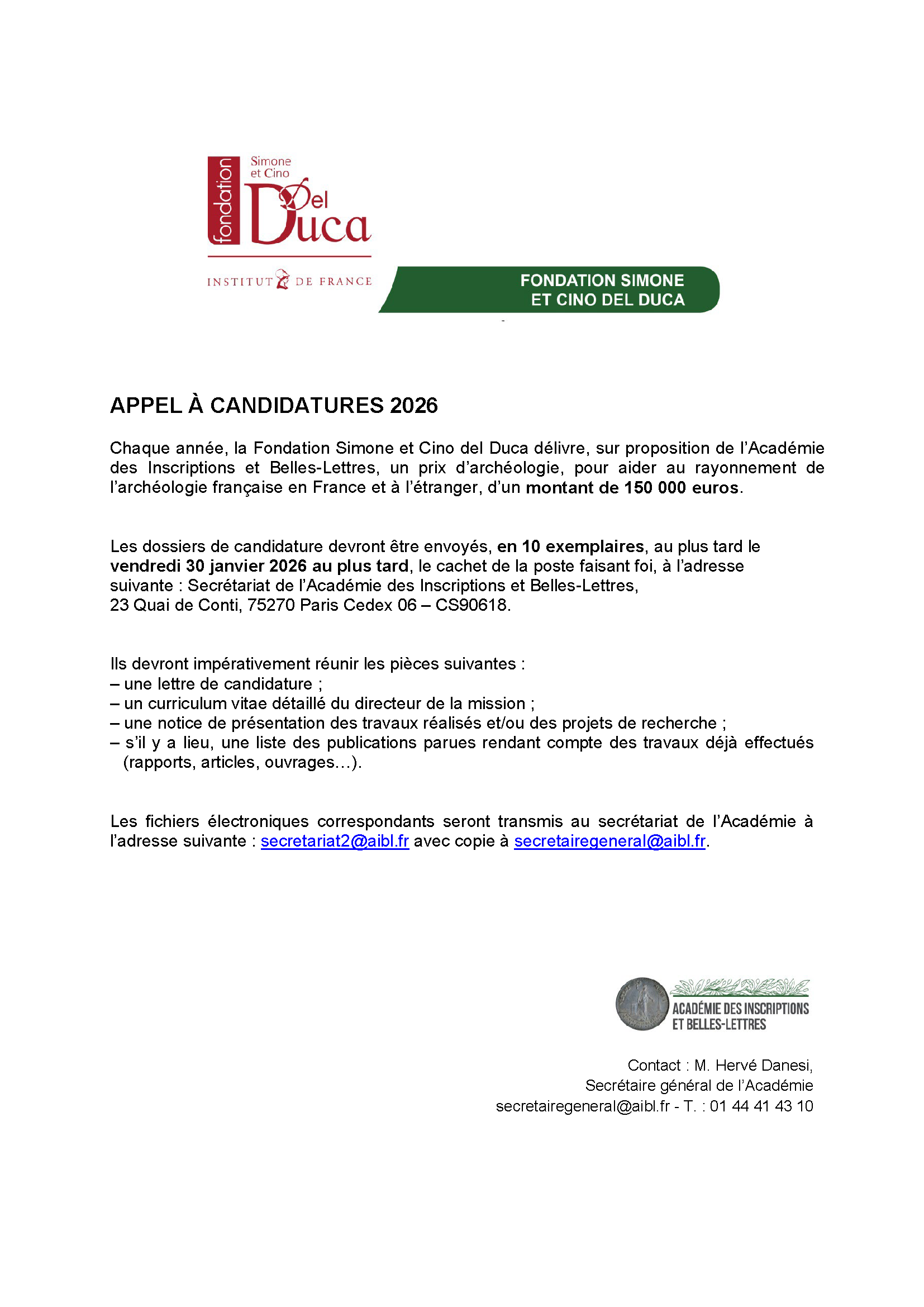 Chaque année, la Fondation Simone et Cino Del Duca délivre, sur proposition de l’Académie des Inscriptions et Belles-Lettres, un prix d’archéologie, pour aider au rayonnement de l’archéologie française en France et à l’étranger.