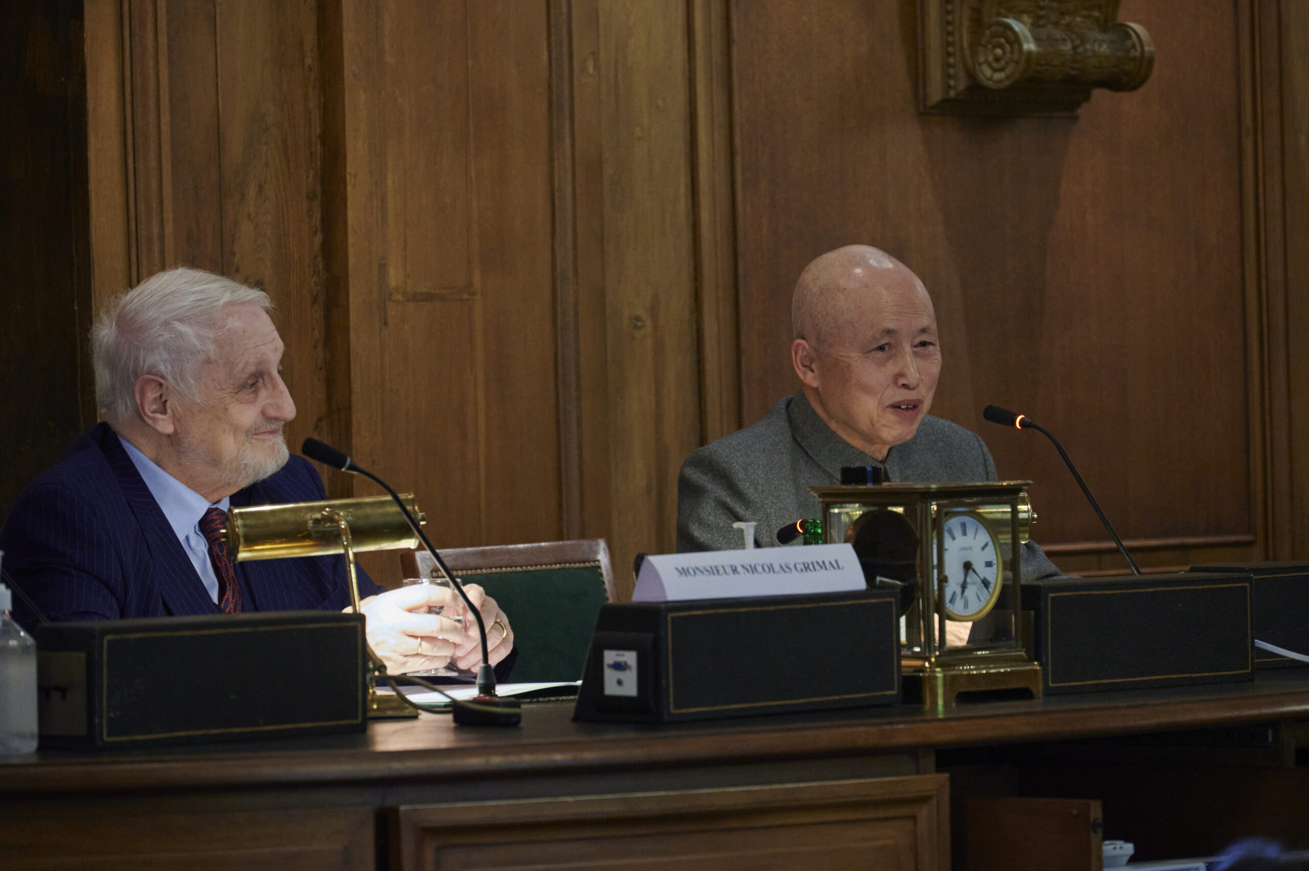 Après une allocution d’accueil au cours de laquelle il a présenté la carrière et les travaux du lauréat, le Secrétaire perpétuel Nicolas GRIMAL a remis dans les mains de M. Wang Bangwei, Professeur à l’Université de Pékin, une médaille et un diplôme (voir cliché de G. Crampes supra).