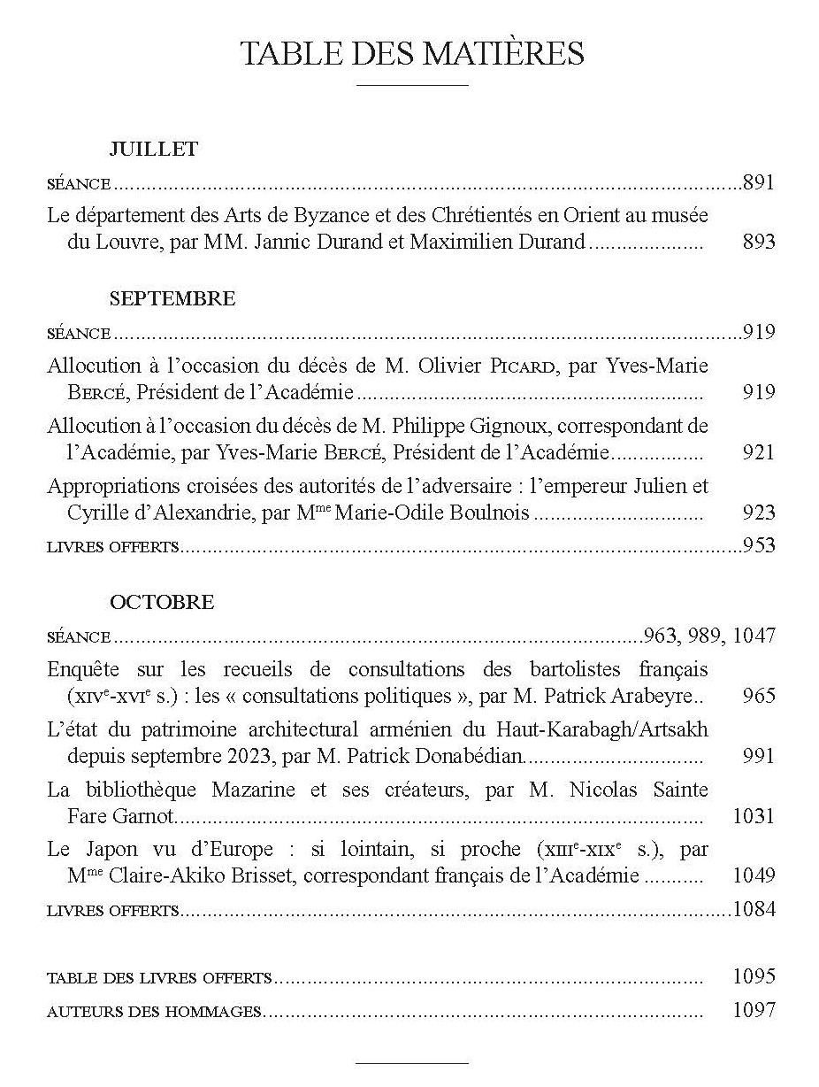 On trouvera également dans ce fascicule six recensions d’ouvrages déposés en hommage devant la Compagnie en vue de distinguer études et travaux récents ainsi que les allocutions pour le décès d’Olivier PICARD, Président de l’Académie et de l’Institut l’an dernier, et de M. Philippe Gignoux, correspondant de l’Académie, prononcées par M. Yves-Marie BERCÉ, élu Président de l’Académie pour occuper le siège laissé vacant par son regretté confrère.