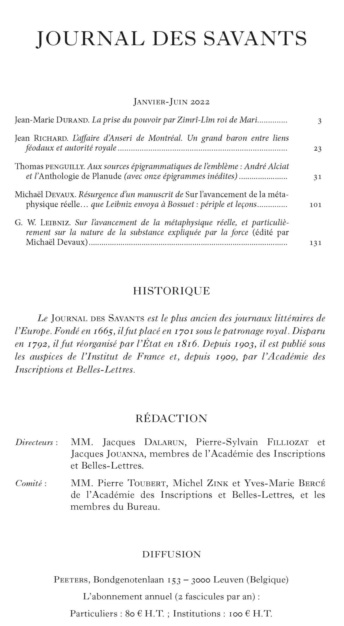En mars 1694, Leibniz publiait dans les Acta Eruditorum un article célèbre où la substance était pensée par la force. Il argumentait, à partir de cette clef, De primæ philosophiæ emendatione – ainsi que commence le titre. Il venait d’inventer la dynamique (1690), et était à la veille de renommer la substance simple « monade » (1695). Il avait envisagé de faire publier la version française de cet article dans Le Journal des sçavans. Cette traduction ajoute environ vingt-cinq lignes en trois passages principalement (mis entre anglets dans notre édition infra). À dessein, le texte avait été envoyé à Bossuet mais ne parut pas. Dom Jean-Pierre de Foris avait édité en 1778 cette traduction française à partir du manuscrit envoyé par Leibniz se trouvant alors encore dans les papiers de Bossuet. Tous les autres éditeurs tant de Bossuet que de Leibniz ont ensuite reproduit l’édition du mauriste, le manuscrit n’étant plus dans les collections publiques ou connues des archives de Bossuet. Les savants éditeurs des Sämtliche Schriften und Briefe de Leibniz, la grande édition académique commencée en 1901, en jugeaient le manuscrit perdu dans le volume A II/2 paru en 2009 qui contenait ce texte. Ni le brouillon, ni le manuscrit mis au propre envoyé à Bossuet, ni une éventuelle seconde mise au propre préparée (?) pour Louis Cousin, éditeur du Journal, ne leur étaient connus. Nous avons exhumé à Oxford le manuscrit envoyé à Bossuet. Nous en retraçons ici le parcours et l’importance et le rééditons, de façon critique pour la première fois. Trois cent vingt-huit ans plus tard, ce texte paraît donc dans le Journal des Savants comme Leibniz en avait formé le vœu !