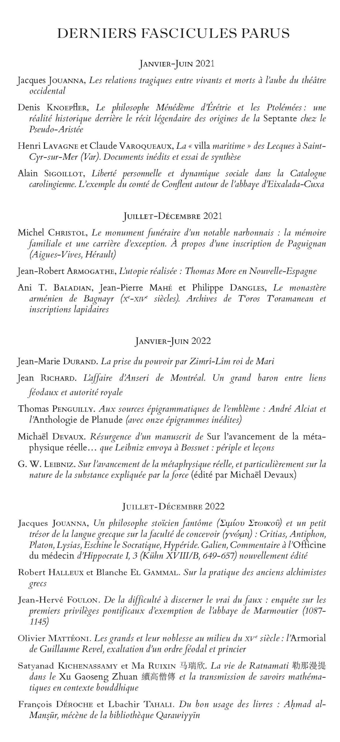 Publications Journal des Savants : Janvier – Juin 2023