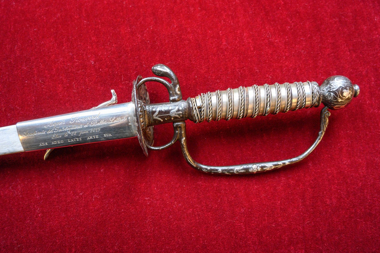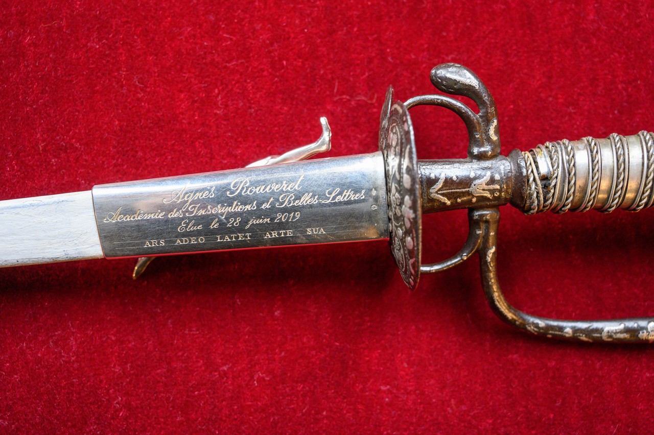 L’épée remise à Mme Agnès ROUVERET est une élégante épée de page datant des années 1720-1730. Son fourreau a été orné par les soins de M. Jean-Claude Dey, d’un côté, de la représentation du célèbre plongeur de Paestum, et, de l’autre, sous l’inscription « Agnès Rouveret, Académie des Inscriptions et Belles-Lettres, élue le 28 juin 2019 », de la gravure du début du vers d’Ovide Ars adeo latet arte sua, « tant l’art se dissimule à force d’art » (Métamorphoses X, 252).