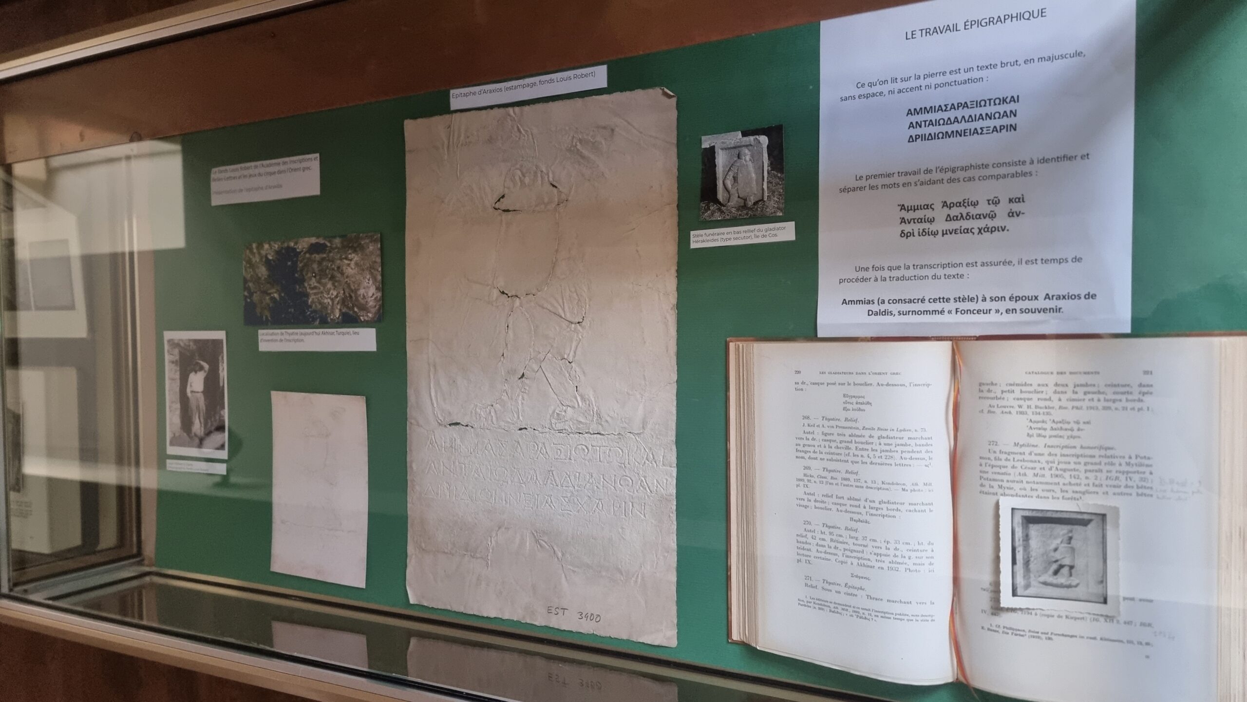 L’Académie a organisé à cette occasion, d’une part, une exposition illustrant la question des jeux dans les amphithéâtres du monde romain, en présentant divers documents conservés dans son fonds Louis ROBERT (1904-AIBL 1948-1985), et plus particulièrement l’estampage de la stèle funéraire d’un gladiateur grec d’Asie Mineure, avec un focus sur l’épigraphie grecque.