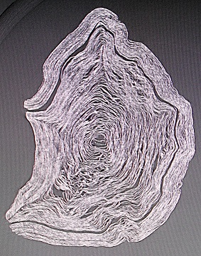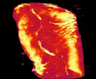 - la présence de poches d’air. A quoi l’on peut ajouter la présence d’un umbilicus – fine baguette qui, dans le cas présent, faisait toute la hauteur du rouleau et dont les extrémités sont d’ailleurs visibles à l’œil nu – autour duquel était enroulé le seul PHerc.Paris.3 (294 grammes) et qui s’est brisé en plusieurs morceaux suivant les déformations imposées au rouleau lors de l’éruption du Vésuve. Le PHerc.Paris.4, en revanche, qui par ailleurs est moins épais et moins lourd (141 grammes) et moins « torturé », était simplement roulé sur lui-même, car les scans ne montrent aucune variation d’intensité en son centre. Comme les deux cas de figure se rencontrent parmi les autres papyrus d’Herculanum, ce constat n’a rien de surprenant. Néanmoins nous n’avons pas réussi à détecter de variations d’intensité qui seraient un effet direct de l’encre.