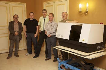 La deuxième partie du projet a consisté à scanner les rouleaux 3 et 4 au moyen de la micro-tomodensitométrie, qui sert à rendre visible la structure interne des objets. Si les tests sur les fragments révélaient des différences de composition chimique mesurables, il était néanmoins impossible de préciser la manière dont ces différences se manifesteraient à l’aide de la micro-tomodensitométrie industrielle, et donc difficile de connaître à l’avance le degré de contraste qu’on pourrait obtenir entre l’encre et son support. Un scanner portable (modèle SkyScan 1173) a été mis à disposition et livré gracieusement par la société SkyScan, de Kontich (Belgique) à l’Institut de France – dont le porche d’entrée a été tout juste assez large pour laisser entrer le camion.